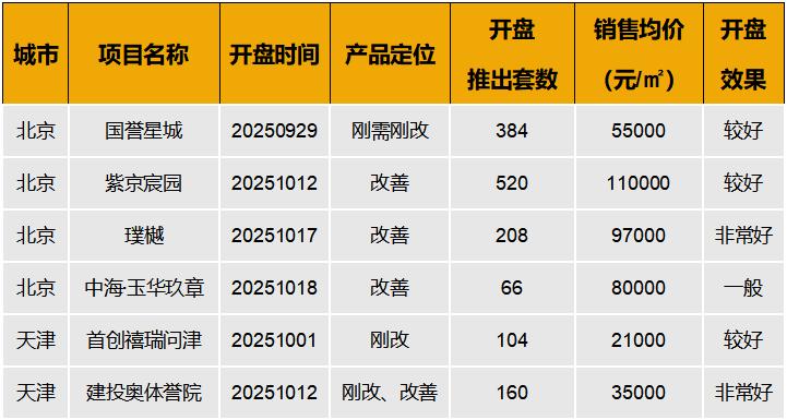 根据中指监测,2025年9月29日-2025年10月26日华北大区重点城市北京、天津两个城市累计开盘6个,推出房源1442套,推出房源量环比下降46.09%。其中,改善类产品热推,占比为66.67%。总体来看,华北大区整体开盘数量有限,刚改、改善类项目为主,整体去化效果向好。