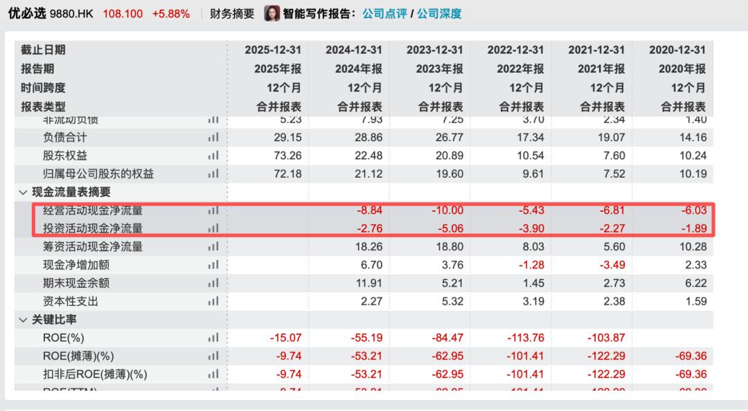 再看现金流。2025年,优必选经营活动现金净流出7.84亿元。拉长周期,据Wind数据显示,2020-2024年,优必选经营与投资现金流连续为负,主要依仗筹资活动支撑运营。不过,截至2025年末,优必选货币资金约49.19亿元。