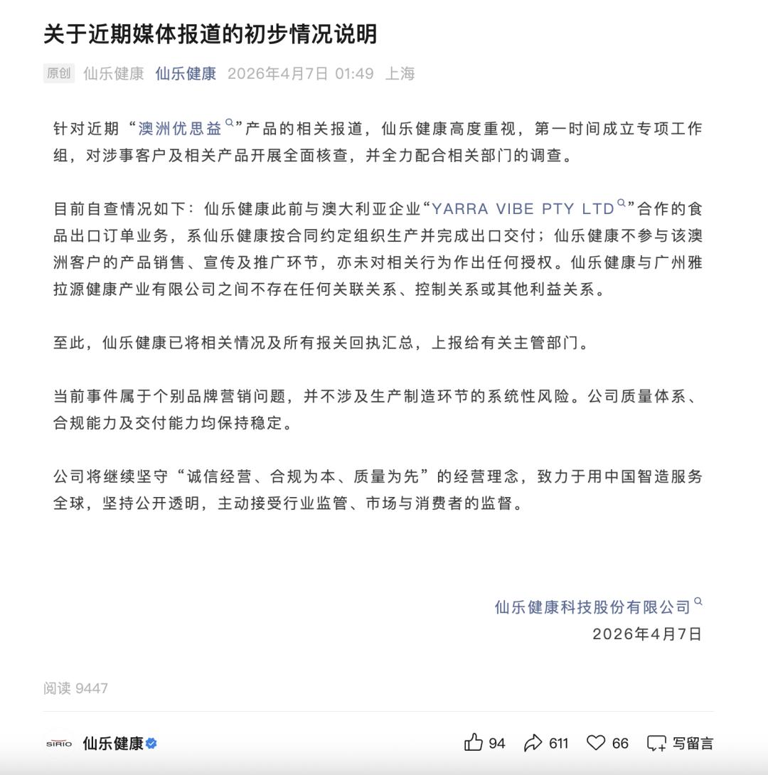 4月7日,仙乐健康发布声明称,已成立专项工作组全面核查并配合监管调查。公司表示,此前与澳大利亚企业“YARRA VIBE PTY LTD”合作的食品出口订单业务,仅按合同约定组织生产并完成出口交付,不参与产品销售、宣传、推广,亦未授权相关行为,且与广州雅拉源健康产业有限公司之间无任何关联,目前相关材料已上报主管部门。