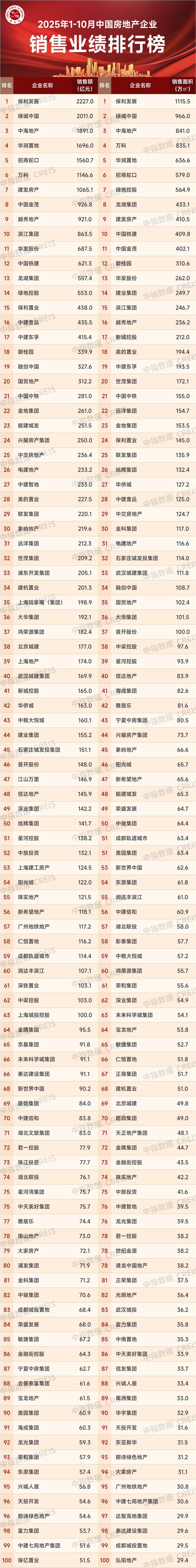 2025年1-10月,TOP100房企销售总额为28967.1亿元,同比下降16.3%,降幅较1-9月扩大4.1个百分点。去年9.26新政后,在“一揽子”政策推动下,房地产市场预期及购房者信心有所恢复,去年10月核心城市市场活跃度大幅提升,受上年高基数影响,导致降幅扩大。10月单月,TOP100房企销售总额环比增长3.7%,绿地控股、兴耀房产集团、中建智地等房企销售表现较为强劲。2025年1-10月,TOP100房企权益销售额为20176.6 亿元,权益销售面积为10352.0万平方米。