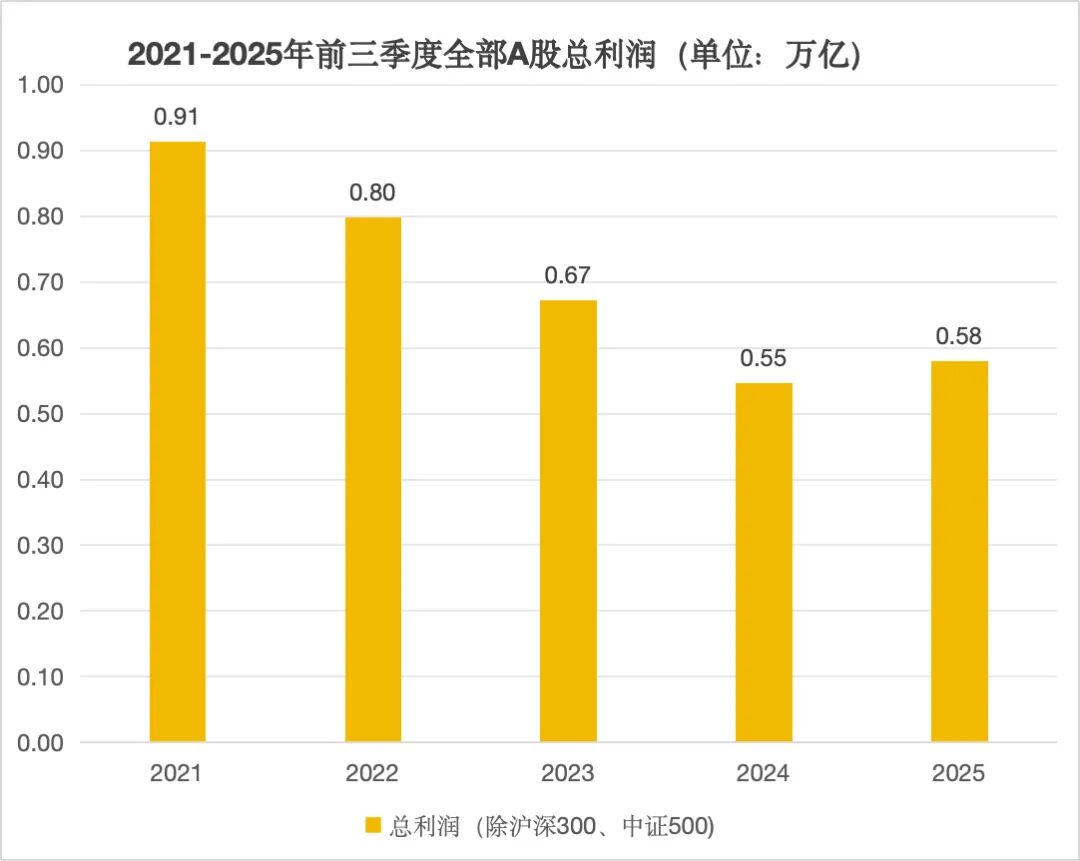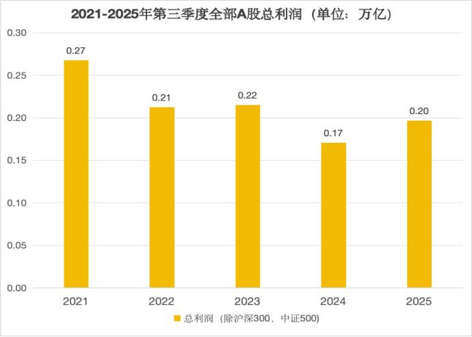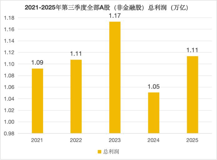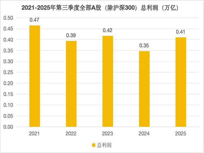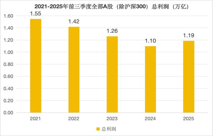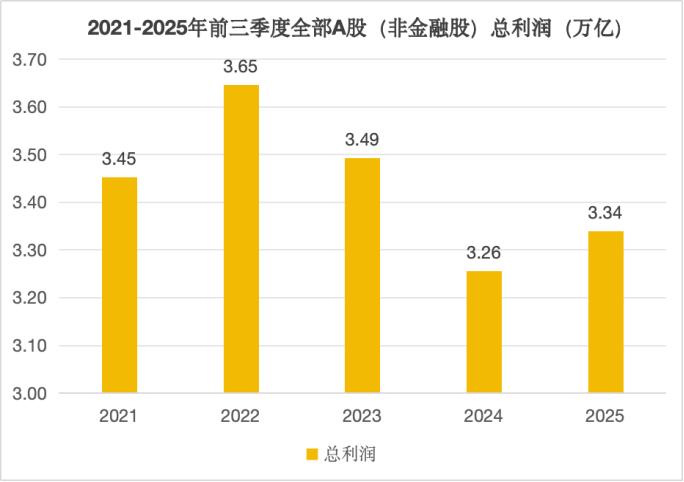 2025年前三季度A股市场除金融股外总利润为3.34万亿元,同比上升2.45%,相较上一年虽有回升但总体涨幅较弱,且显著低于2021-2023年同期总利润水平。