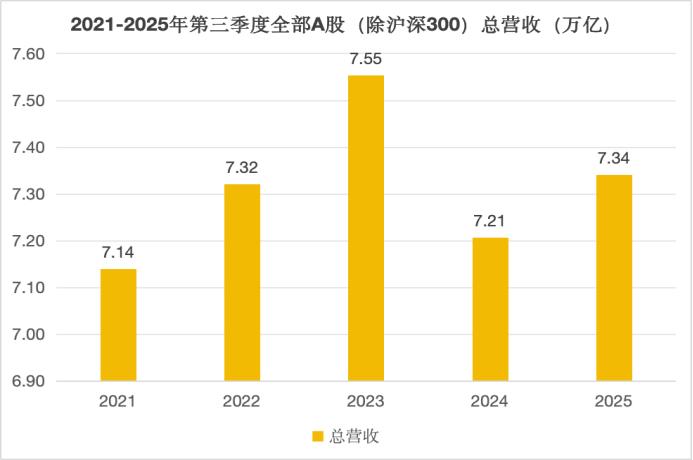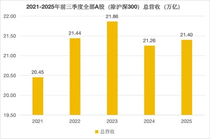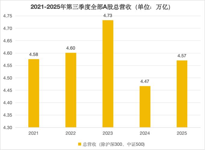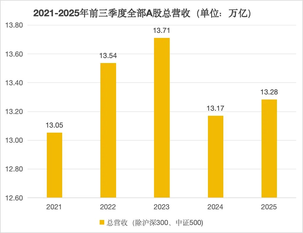 2025年前三季度A股(除沪深300、中证500)总营收为13.28万亿元,同比上涨0.84%。近五年,这一指标在2023年达到顶点,为13.71万亿元,只占当年前三季度A股总营收的25.62%。