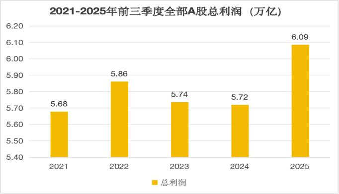 对比之下,2025年前三季度A股总利润为6.09万亿元,同比上涨6.47%,打破了自2022年起A股前三季度总利润不断下滑的趋势。