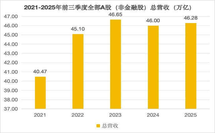 2025年总营收(除金融股)为46.28万亿元,同比涨幅仅0.61%,2022年至2025年整体稳定,虽自2023年起有下滑,但除去金融股,2025年前三季度A股市场总营收已比2021年提升了14.36%。
