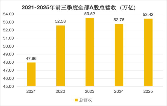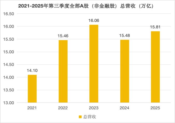 排除金融股后,2025年第三季度总营收为15.81万亿元,该报告期内金融股占总营收的14.22%,与2025年前三季度差别不大。且就2021-2025年第三季度全部A股(非金融股)的变动趋势来看,与近五年前三季度总营收趋势一致。