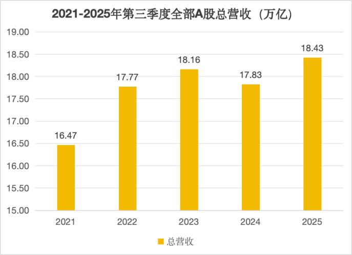 2025年第三季度A股总营收为18.43万亿元,同比上涨3.37%。2025年第三季度总营收为近五年最高,相较2021年提升已达11.90%。