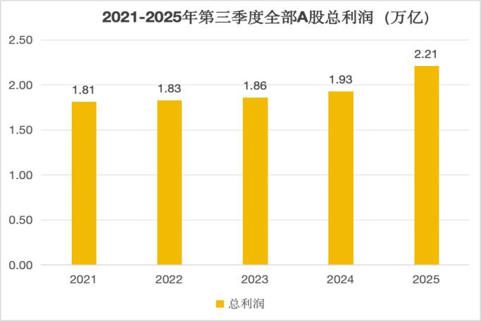 而2021-2025年第三季度A股市场总利润呈稳步上升趋势,前四年上升较为平稳,且涨幅也在逐年上升,但总体低于3.76%。2025年涨幅明显加大,达到14.51%,A股市场整体获利能力显著上升。