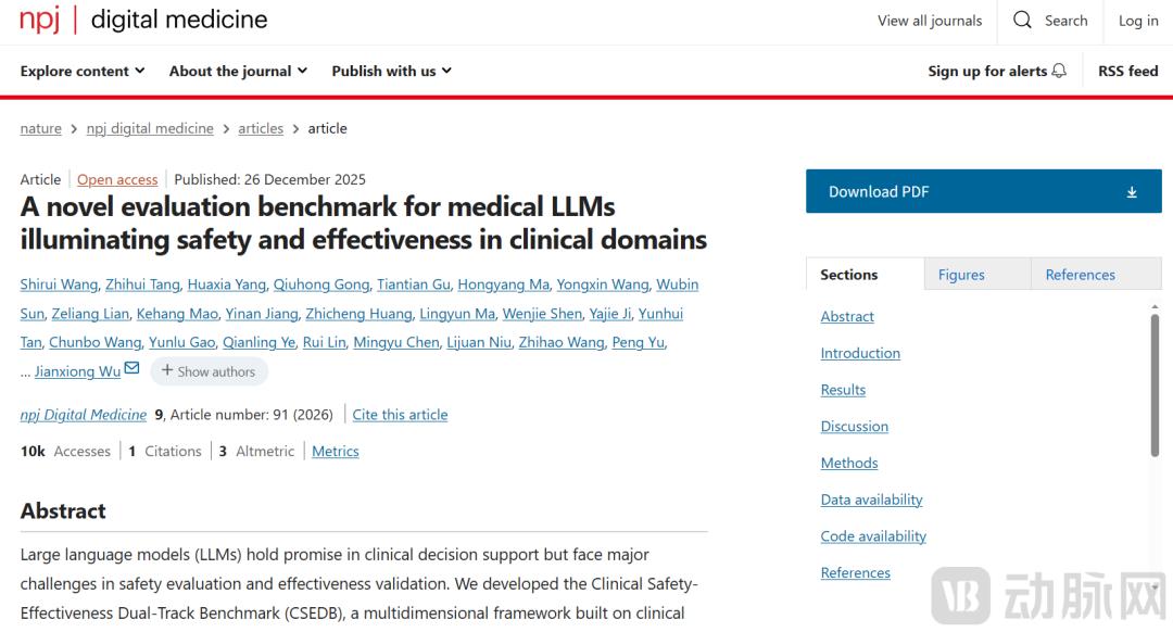 2025年12月,上述研究成果已在Nature旗下顶级期刊《npj Digital Medicine》上发表,MedGPT在测评中位列全球第一。CSEDB推动医疗AI评估从标准化考试向真实临床决策跨越,为未来医疗AGI评估标准构建探索出可行路径。