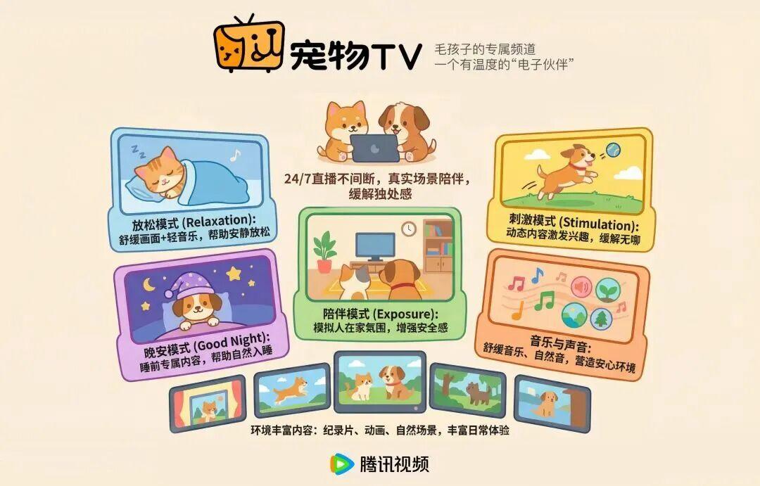 作为国内主流长视频平台中首个专为宠物设计的内容频道,其引入国际专业宠物内容库DogTV等优质资源,推出24小时不间断无广告直播,打造适配宠物的专属视听内容,核心目标是缓解宠物独处焦虑、减少拆家等行为问题,助力宠物获得更健康轻松的生活。