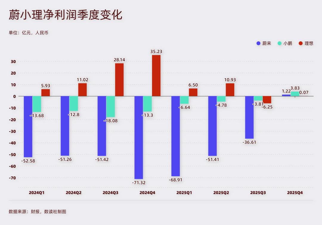 与之相比,理想在2025Q3亏损6.3亿元,Q4勉强回到盈亏平衡,净利润仅0.07亿元,全年盈利仅靠上半年支撑。