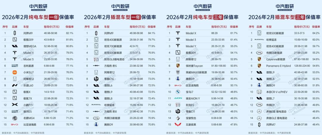 此外,中汽数研2月中国新能源汽车保值率研究报告显示,纯电车型一年保值率前十名中,蔚小理只占据两席;插混车型占据两席。三年保值率中,蔚小理分别占据0席和两席。品牌保值程度并没有显著高于其他车企。