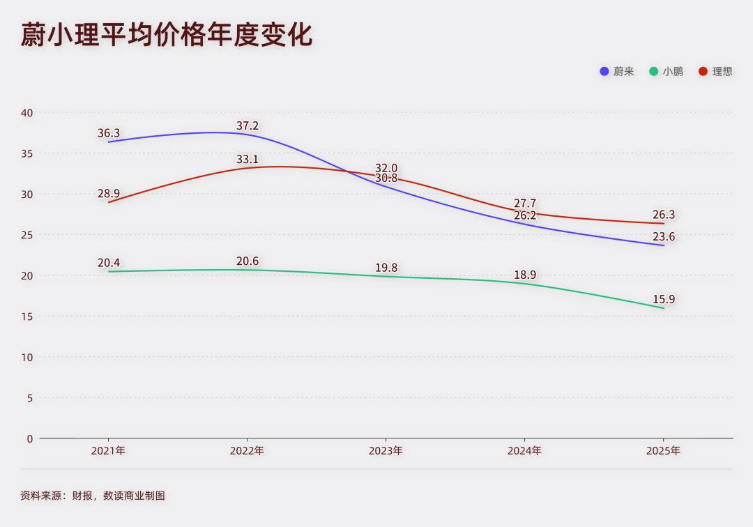 车企没有公布ASP,但结合汽车销售收入与销量,粗略估算,从2021年到2025年,蔚来的ASP从36.28万元降至23.58万元,累计下降35%。
