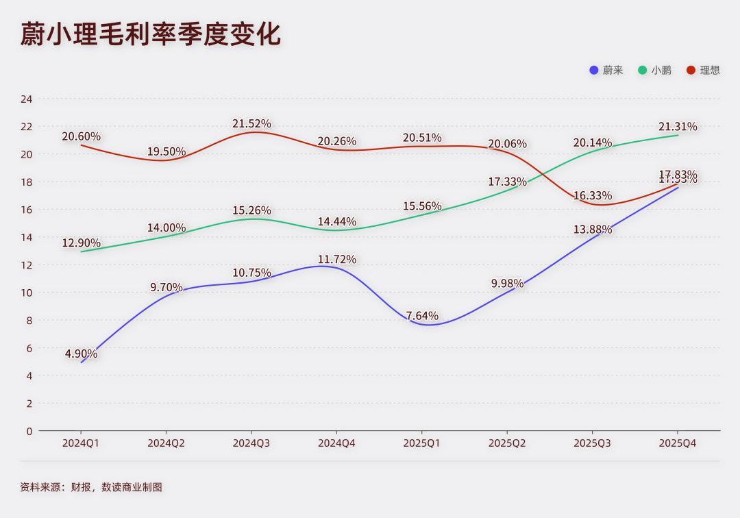 2025年,理想的毛利率连续两个季度跌破20%红线,这是创始人李想曾经十分看重的红线。与之相比,小鹏连续两个季度突破20%,蔚来也一路飙涨,四季度几乎与理想持平。