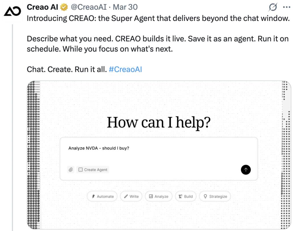3 月 30 日,硅谷初创公司 Creao AI 的新品 CREAO 一经发布,便迅速冲上 X 平台全球热搜榜,引发网友热议,多家媒体跟进报道,资本也在关注。