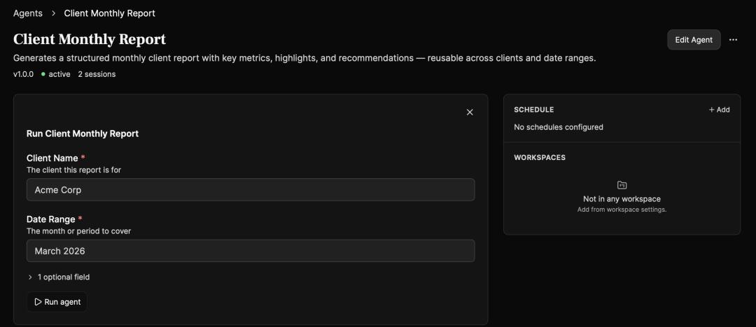 到这里,好像和一般 AI 工具没什么不同,但变化在于这段对话被保存为一个可复用的 Agent,只保留两个变量字段:「客户名称」和「时间范围」。