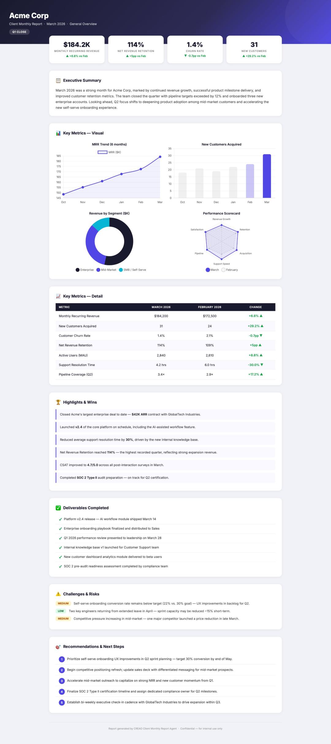 比如,你输入提示词:「为 Acme Corp 生成一份 2026 年 3 月的专业月度报告。包括关键指标、图表、亮点、风险和建议,并以 PDF 格式输出」,之后系统会自动生成整套执行逻辑,并完成了一份完整报告。