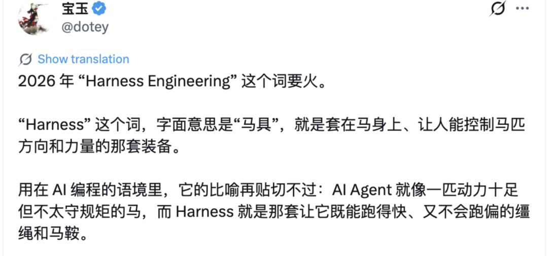 就像博主「宝玉」所言,「Harness」直接释义是「马具」,套在马身上、让人能控制马匹方向和力量的那套装备,用在 AI 编程的语境里就是,「AI Agent 就像一匹动力十足但不太守规矩的马,而 Harness 就是那套让它既能跑得快、又不会跑偏的缰绳和马鞍。」