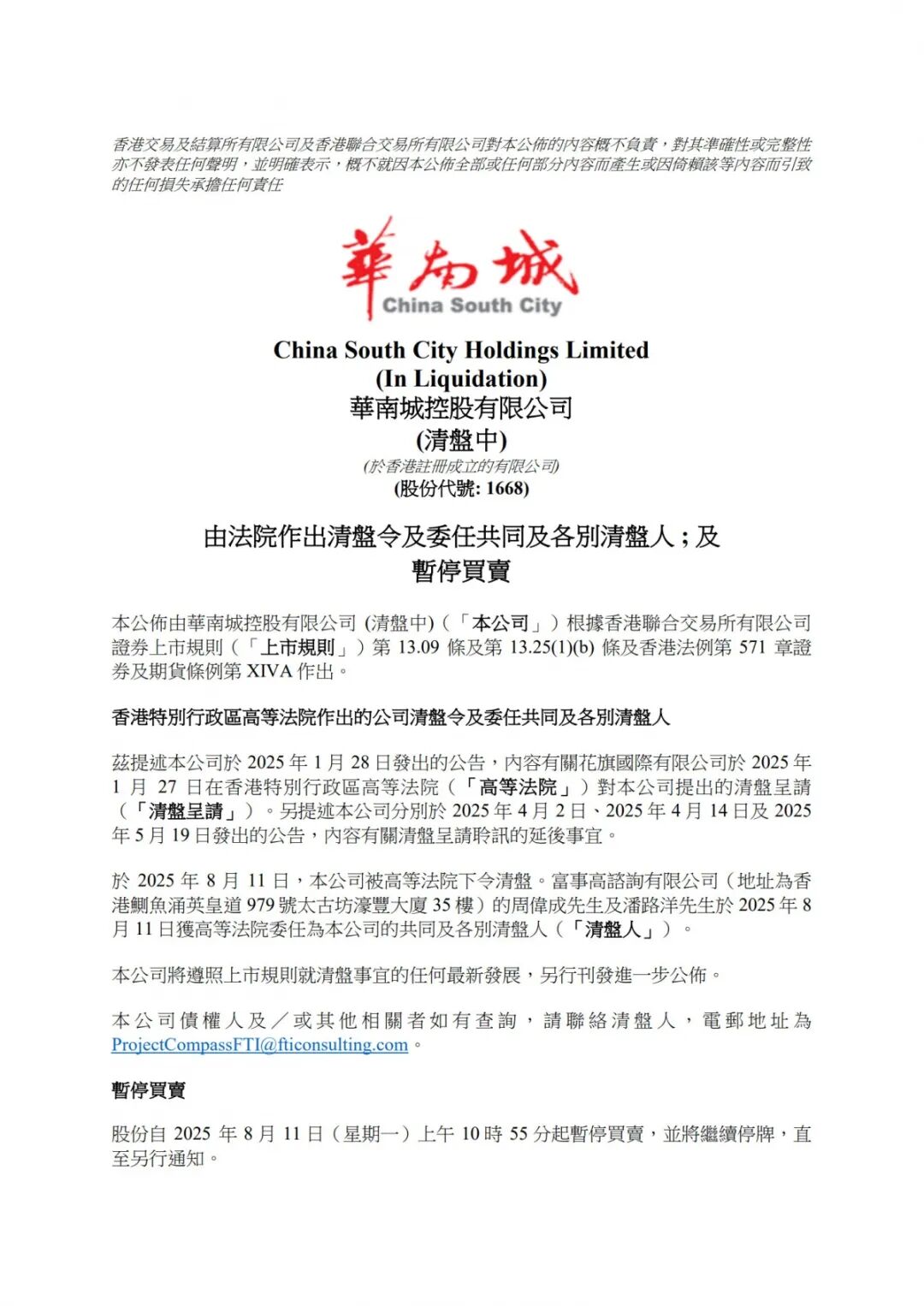 在港交所紧急停牌前,华南城股价报0.107港元,单日下跌1.83%,市值仅剩12.24亿港元,较历史高点蒸发逾98%。此次清盘申请由债权人花旗国际发起,直接导火索是华南城未能偿还2024年4月到期的3.06亿美元优先票据欠款。