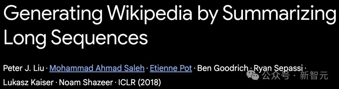 Google Brain团队曾于2018年发表《Generating Wikipedia by Summarizing Long Sequences》,Łukasz Kaiser是作者之一,主题就是端到端生成维基百科条目。