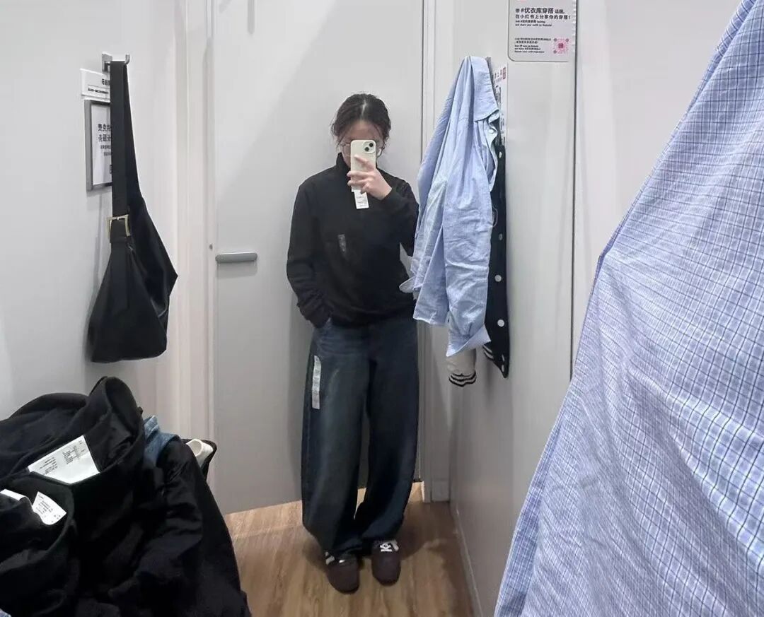 她第一次试穿弯刀裤,是在优衣库的门店。当时这款新品刚刚上架,橱窗模特穿得潇洒利落,卷卷也心动了。但轮到自己上身,效果天差地别,模特是随意慵懒,自己却成了裤腿晃荡、O形腿的大佐。“搞不懂到底谁在说弯刀裤好看!”