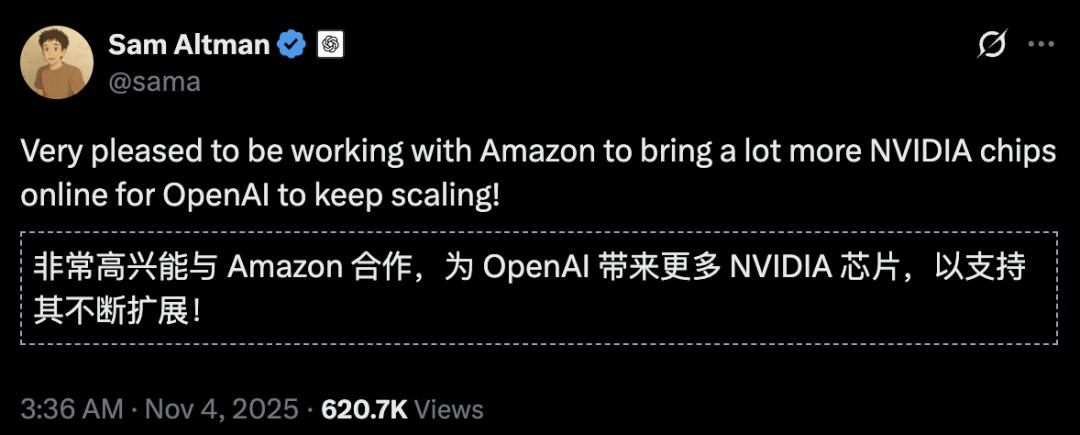 刚刚,奥特曼宣布OpenAI与Amazon达成合作,将得到更多算力保持不断Scaling。