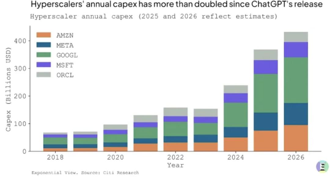 有报道称,2026至2027年间,美国企业在AI基础设施上的支出预计将突破5000亿美元。