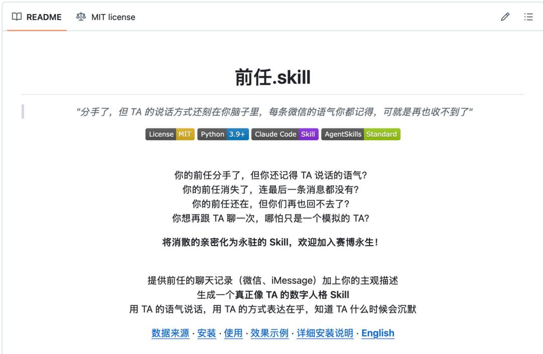 “前任.Skill”成了另一个现象级爆款。支持直接解析微信聊天记录导出的数据库文件。