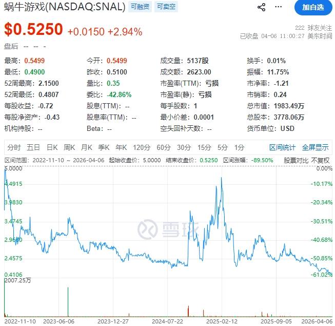 在2024年7月,蜗牛游戏就因为连续30个交易日的普通股收盘价低于每股1美元而被受到退市警示。10月份蜗牛游戏股价出现了直线拉升,并重新满足了上市要求。在曝光了新作开发进度、次年2月宣布了GDC参展计划之后,公司股价更是拉升到每股超过4美元。但在之后的一年里,股价再一次波动下滑,最低已经跌破每股0.6美元。