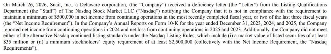 3月底蜗牛游戏收到了美国纳斯达克上市资格部门发出的警示函。通知中指出,蜗牛游戏未能满足最近1个财年、或过去3个财年中的其中2个财年里,持续经营净收入超过50万美元的这一要求。同时蜗牛游戏也不满足其他替代性上市规定,包括市值至少为3500万美元、或股东权益至少为250万美元。