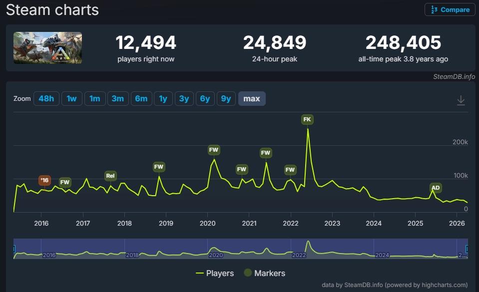 以主力产品《方舟:生存进化》为例,其Steam版本在早些时候通过免费周末和免费入库不断创下了同时在线玩家数量的峰值,不过在2022年之后就逐渐走向下滑。虽然游戏在去年发售了DLC《方舟:夏日海洋》后人数稍有回涨,但仍未扭转下滑趋势。