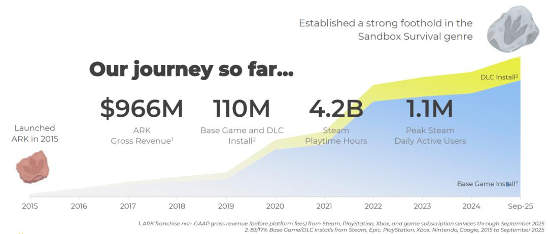 ARK系列作品也被视作为长线创收的重要途径,其中一个收入增长来源就是DLC的销售。例如的《方舟:生存飞升》(ARK: Survival Ascended,简称为ASA)在2025年发售了DLC《方舟:诸神黄昏崛起》《方舟:失落的殖民地》,帮助蜗牛游戏的季度收入能够维持在2000万美元。