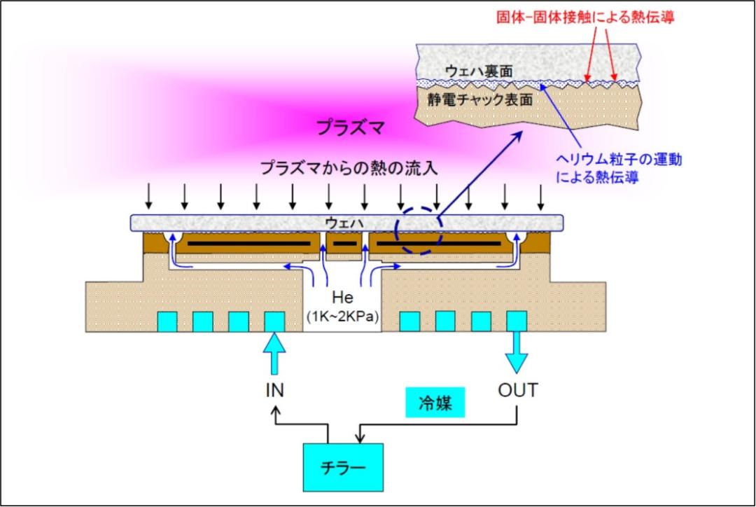 在干法刻蚀过程中,热量不仅通过等离子体的辐射热传递到晶圆,还通过离子、中性自由基和电子的入射以及各种波长的紫外光照射传递。如果不采取措施抵消这些热输入,晶圆温度将无限升高,导致刻蚀速率、选择性比和图案形状等刻蚀特性无法控制。此外,晶圆表面这些刻蚀特性的均匀性也会受到影响。