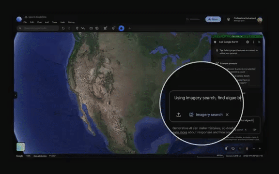 谷歌表示,自去年开始试点的集成对话功能,可帮助用户在卫星影像中发现目标与规律。例如,用户只需输入「查找藻华」,即可让谷歌地球监控饮用水源状况。