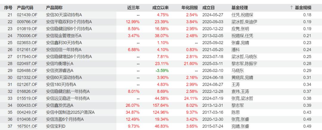 4月1日,Wind数据显示,截至最新统计,安信基金旗下有37只基金产品(初始基金)的规模低于5000万元,多为股票型与混合型基金产品。