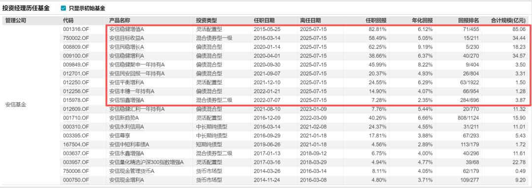Wind数据显示,截至其离任张翼飞管理的9只基金任职回报均为正,其中任职回报超过50%的基金有3只,表现最为突出的“安信稳健增值A”,任职回报高达82.81%,管理时间长达10年,离任时该基金合计规模达85.02亿元,是安信基金的标杆产品。