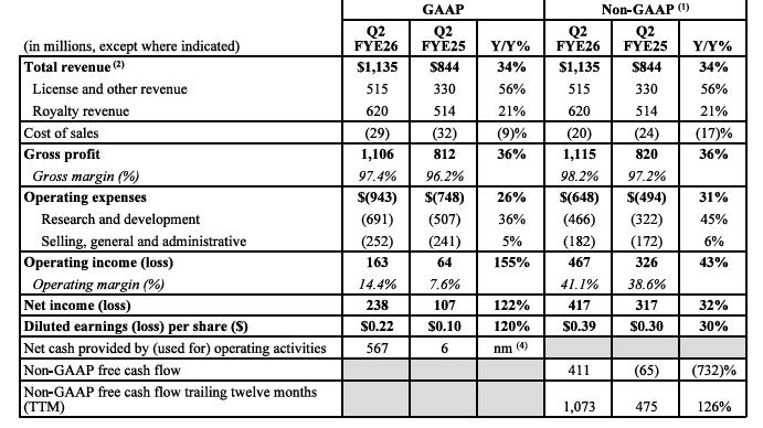 授权及其他收入同比增长56%,达到5.15亿美元。该增长主要源于多个高价值授权协议在签署时间与规模上的正常波动,以及前期积压订单的陆续确认。