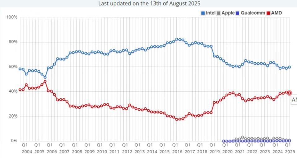 2016年AMD在CPU市场的份额不到18%,然而到2019年却重新站上30%,最新市占率在39%左右,并长期维持双寡头的格局。