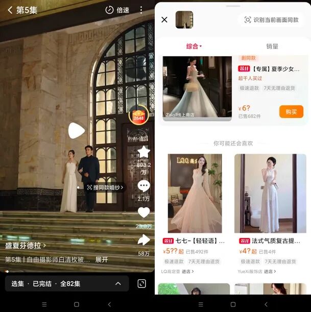 根据商业新研社的体验,该功能已覆盖红果短剧上《盛夏芬德拉》、《好一个乖乖女》等主流剧集。当用户暂停观看时,系统会自动识别剧中服装、饰品等商品并弹窗推荐,点击即可进入详情页;未自动弹出时,也可通过右上角“识图搜同款”定向识别,服饰、家居等高频品类识别准确率较高。