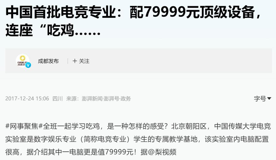 隔年,国内至少22所院校招收了电竞方向的学生。尽管高校快速扩招,据21世纪经济报道当时(2017年)国内电子竞技产业链涉及9个电竞行业方向,国内电竞公司多达1万多家,需求职位方向达36个,岗位空缺达26万个。