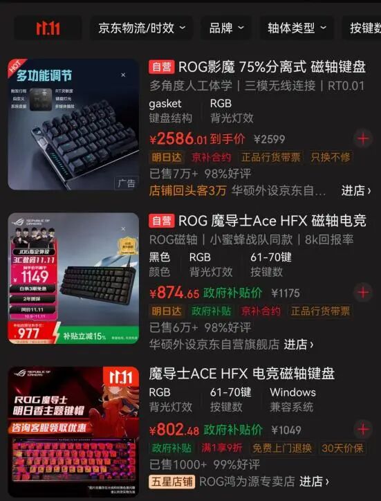华硕ROG磁轴键盘、雷蛇光轴键盘,爆款产品随随便便一把就是一两千块;