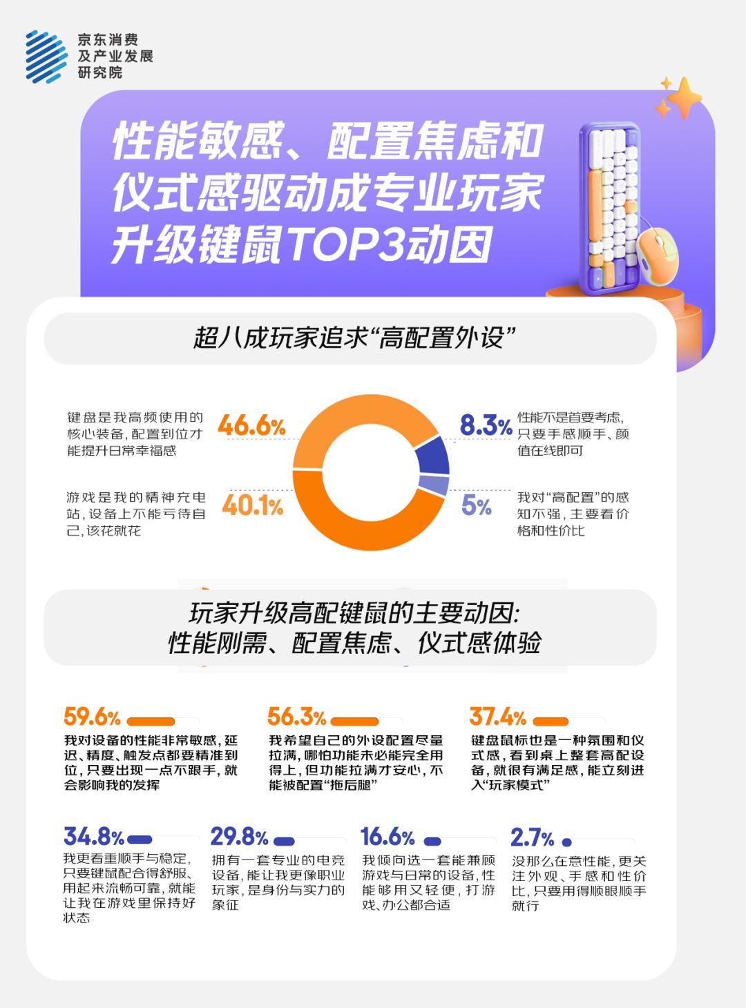 京东研究院的调研数据也显示,游戏玩家已然成为外设消费主力,四成玩家预算在500元以上,主动换新比例甚至高达60%,其中性能敏感、配置焦虑、仪式感体验是驱动玩家键鼠高配置升级的三大关键因素,高达86.7%的玩家认为“为喜欢的设备多花点钱值得”。外加职业明星选手的示范效应,专业的工具成为了玩家心中的“能力背书”从而变成了爆款产品。