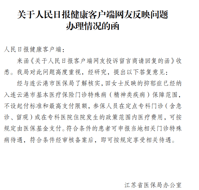 随后,记者将田女士遇到的问题反馈给江苏省医保局,该局回应称,经与连云港市医保局了解核实,田女士反映的抑郁症已纳入连云港市基本医疗保险门诊特殊疾病(精神疾病)的覆盖范围,不存在起付标准和最高支付限额。参保人员在定点专科门诊(含急诊、观察)或专科医院住院发生的医疗费用,可按规定由医疗保险基金支付。符合条件的患者可申请当地门诊特殊治疗,经审核备案后按规定享受相关待遇。