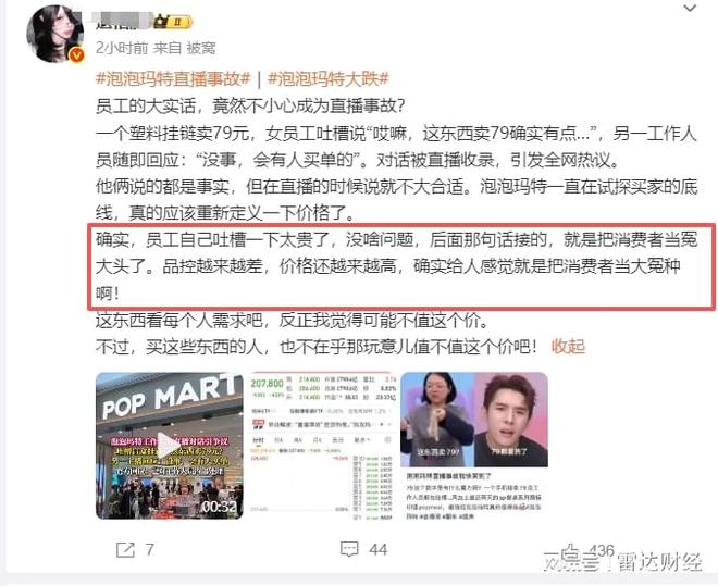 “确实,员工自己吐槽一下太贵了,没啥问题,后面那句话接的,就是把消费者当冤大头了。品控越来越差,价格还越来越高,确实给人感觉就是把消费者当大冤种啊!”一位加V微博用户发文称。