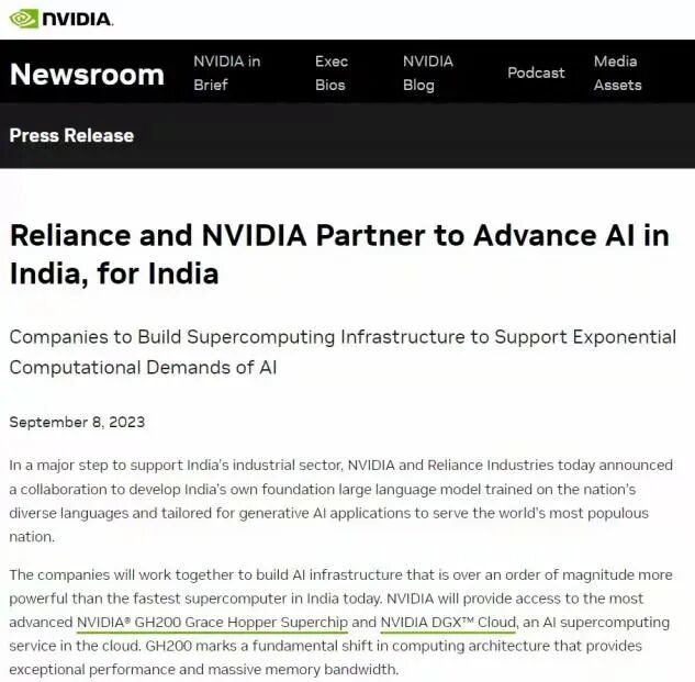 算力层面,穆克什·安巴尼同样出手果断。2023年,信实和英伟达达成深度战略合作,在印度建设全球领先的AI算力中心,推出了针对印度市场的多语言大模型Jio AI,支持多种印度本土语言。