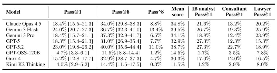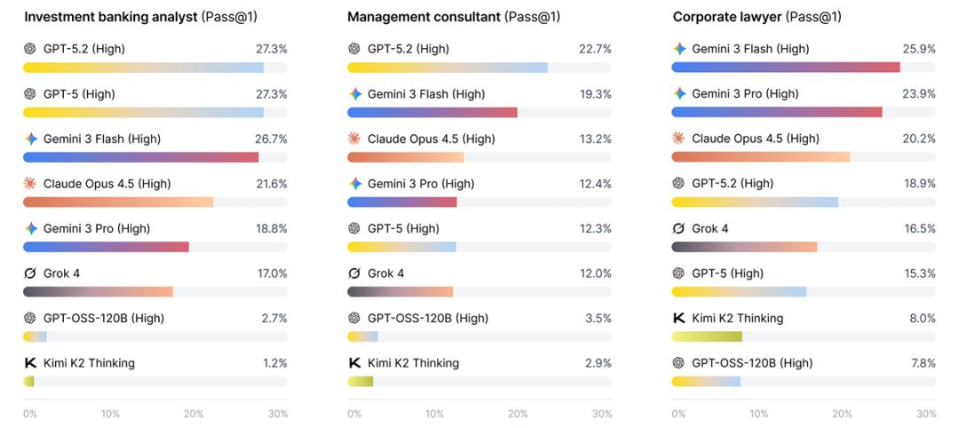 面对APEX-Agents的Pass@1(一次通过率)排行榜结果,任何出于商业化目的鼓吹“AGI即将实现”的说法都不攻自破。