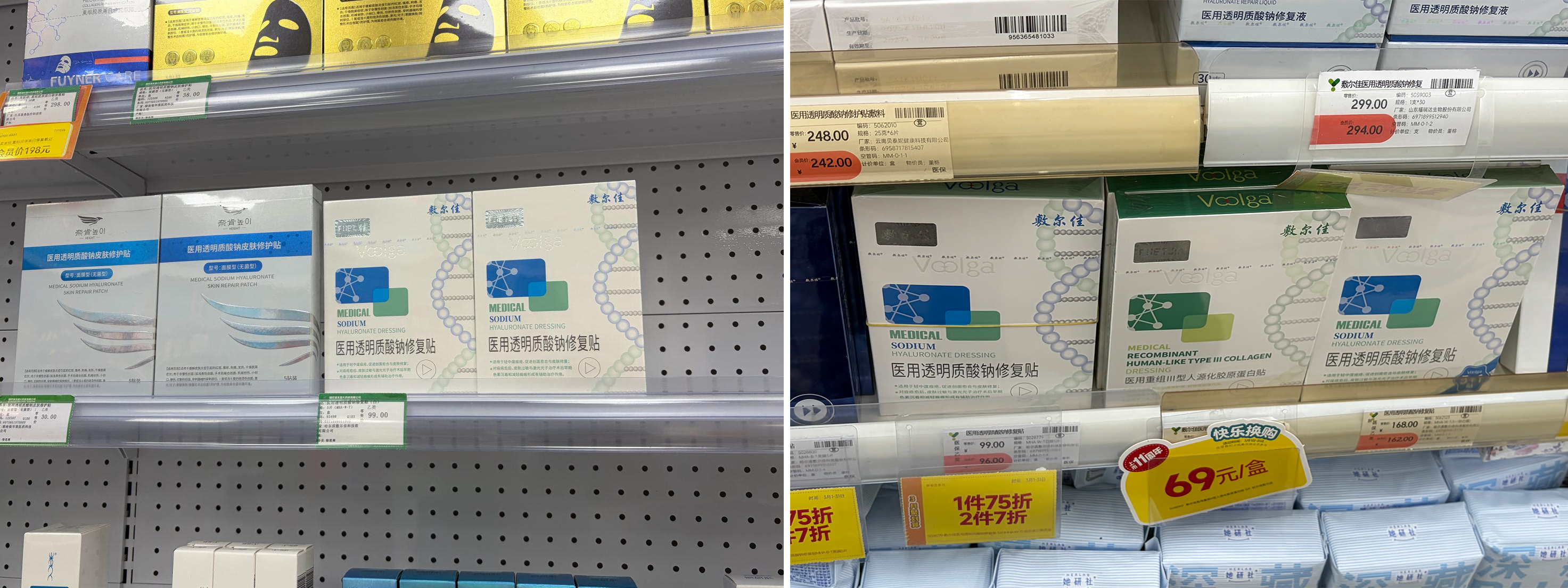 例如,在老百姓大药房,可复美重组胶原蛋白敷料售价594元4盒,另赠1盒涂抹式敷料,折合单片均价约29.7元;薇诺娜透明质酸修护贴敷料售价248元2盒,每盒6片,折合单片均价约20.6元。