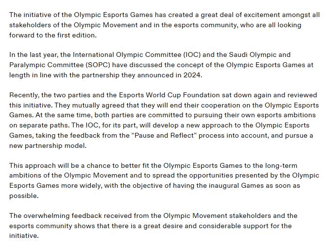 目前IOC官网电竞页面显示,尽管最初与沙特阿拉伯奥林匹克和残奥委员会合作,但IOC正在寻求一种新的合作模式和更完善的方法,以确保电竞奥运会与奥林匹克运动的长期目标保持一致。