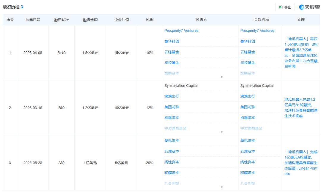天眼查显示,地瓜机器人成立于2024年,至今已完成三轮融资,企业估值达到15亿美元(约102.51亿人民币)。投资方阵容更是星光熠熠,囊括高瓴资本、五源资本、美团龙珠、滴滴出行、淡马锡旗下 Vertex Growth 等一线投资机构、产业资本和互联网大厂。