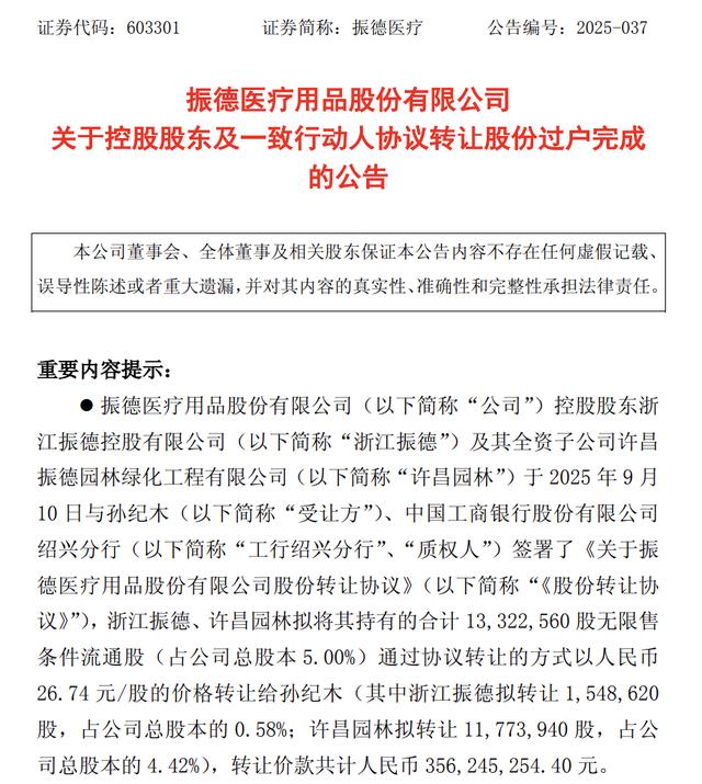 10月18日,该笔协议转让完成过户。根据协议内容显示,股份转让完成之后孙纪木承诺未来12个月不减持振德医疗股份,且该笔协议转让不触及要约收购、不构成关联交易、不会导致公司控股股东及实际控制人发生变化。