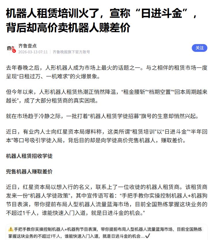 “擎天租”尽管有智元机器人这一头部厂商背书,但对于缺乏行业资源、不懂技术维护的普通投资者来说,擎天租加盟的风险,远比“风口红利”更残酷。